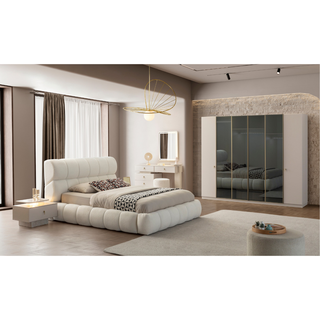 1 Adet Gardırop, 1 Adet Karyola ve Başlığı, 2 Adet Komodin, 1 Adet Şifonyerden oluşmaktadır.
